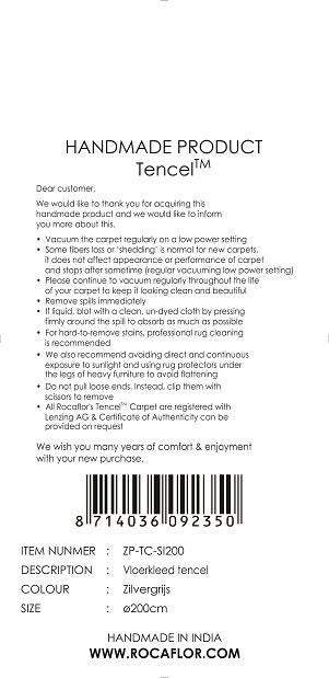 Wij adviseren tencel als vrijliggend vloerkleed te gebruiken en geen meubelen (zoals kasten, eettafels en stoelen) op te plaatsen ter voorkoming van afdrukken in het kleed. m.n. bij zwaardere meubelen zullen afdrukken in de pool zichtbaar zijn. Bij lichte druk zijn de afdrukken met de hand weg te wrijven.(Gebruiksaanwijzing en onderhoud: zie label svp zoals op foto bijgevoegd)