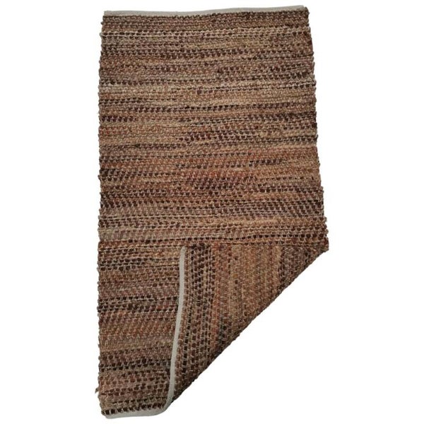 Dit vloerkleed is handgeweven van jute en gerecycled leer in bruintinten. Het kleed heeft een stoer landelijke style en past mooi in een landelijk, botanische sfeer. Dit kleed heeft een kleiner formaat en is geschikt voor een kleinere ruimte of naast het bed. Naast dit formaat kleed, zijn er ook andere formaten beschikbaar, mooi voor de huiskamer, slaapkamer of in een recreatiewoning.